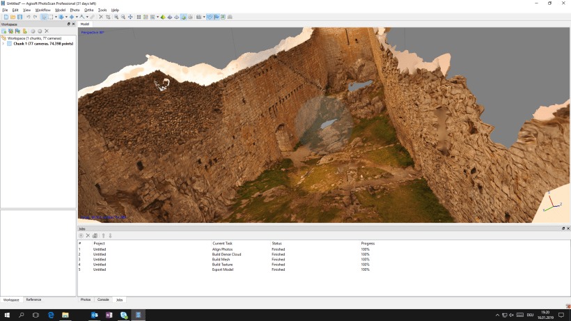 So once the point cloud exists, you can build the actual model. The texture will be added on top of these surfaces created by the triangles. However, if you’re only interested in the surface, you can skip the texture alltogether. Most people like it because it really makes your result look nice (see my examples). But the scientifically interesting stuff is in the mesh.