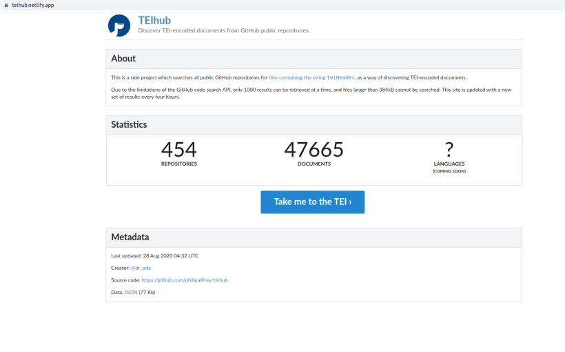 A conversation I had on Twitter during #100DaysOfDH about examples of TEI reminded me of an idea I had previously had, to use GitHub search as a means of discovering other projects using TEI. I investigated a bit and thought it shouldn’t be too difficult. I ended up using a bunch of new-to-me tools (GitHub actions, Eleventy static site generator, FaunaDB NoSQL database, Netlify web hosting and automated builds) to create an automated pipeline that queries GitHub every four hours for recently updated TEI files, aggregates these with previous results, rebuilds the website, and tweets an interesting repository from these results. I’m very pleased with how this turned out, and the fact that it now runs autonomously. It seems other people are finding it useful too, as my Twitter bot, Satei P the @TEI_Pelican, has over 40 followers.